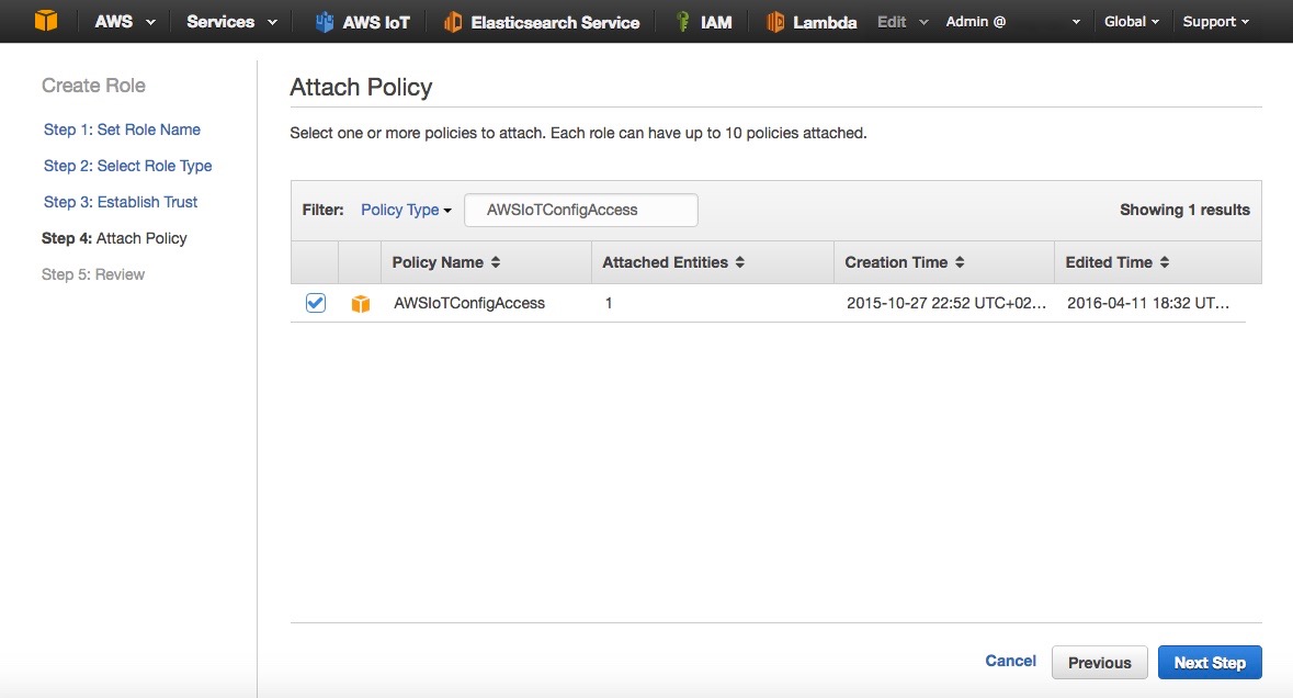 aws iam attach-role-policy --role-name iot_lambda_role --policy-arn arn:aws:iam::<your-aws-account-id-here>:policy/anom_det_policy